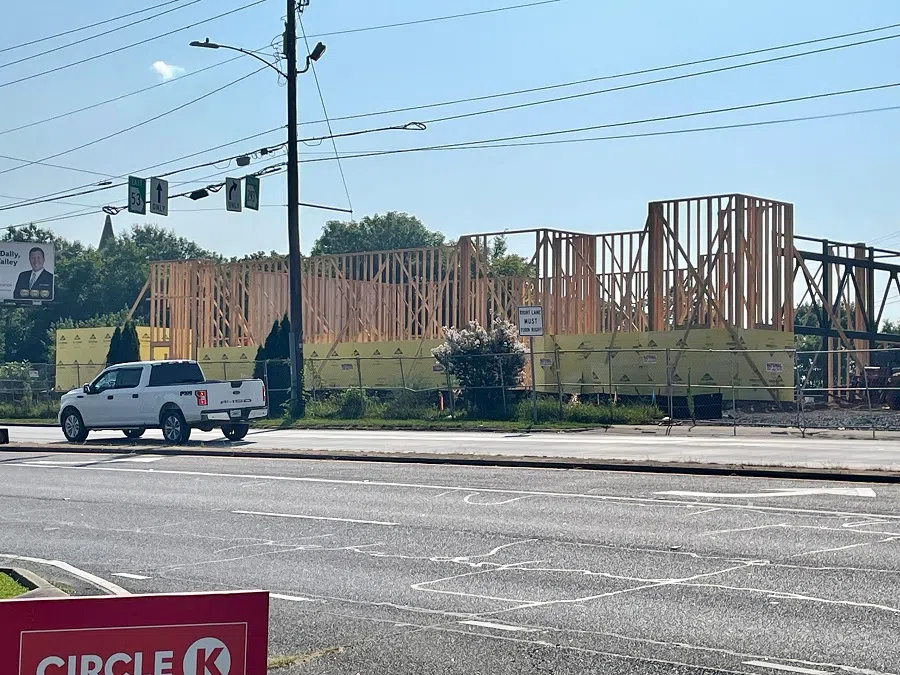 The old Dairy Queen building at Five Points has been demolished and now the new Varsity restaurant is starting to go up.