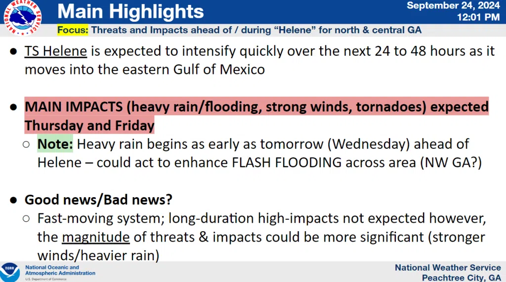 According to Floyd County Emergency Management’s Tim Herrington, Tropical Storm Helene is expected to intensify into a major hurricane (Category 3 or higher) earlier than anticipated for Northwest Georgia.