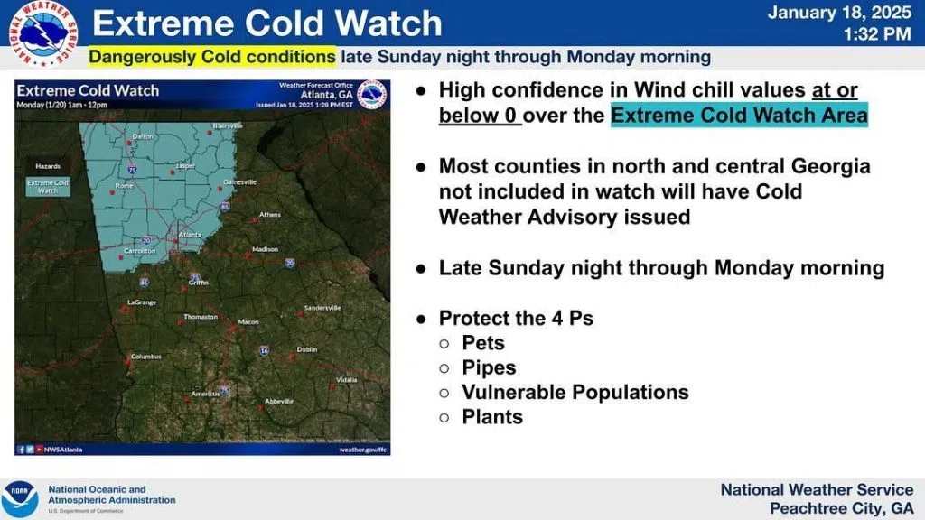Dangerously cold wind chills that will likely be at or slightly below 0 by sunrise on Monday in portions of north-central, northeast, and northwest Georgia.