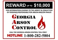 A reward of up to $10,000 is offered for information leading to the arrest and conviction of the person or persons responsible for arson in Georgia.