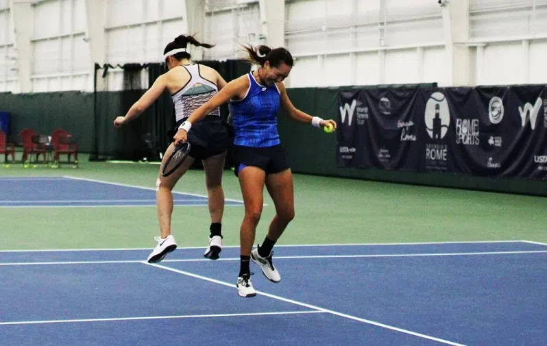 Sophie Chang and Angela Kulikov jump for joy Saturday after they beat Whitney Osuigwe and Eva Vedder 7-6, 6-4, to win the doubles title at Georgia’s Rome Tennis Open. The event, a week of competition featuring the rising stars of women’s professional tennis, wrapped up Sunday at the Rome Tennis Center at Berry College.