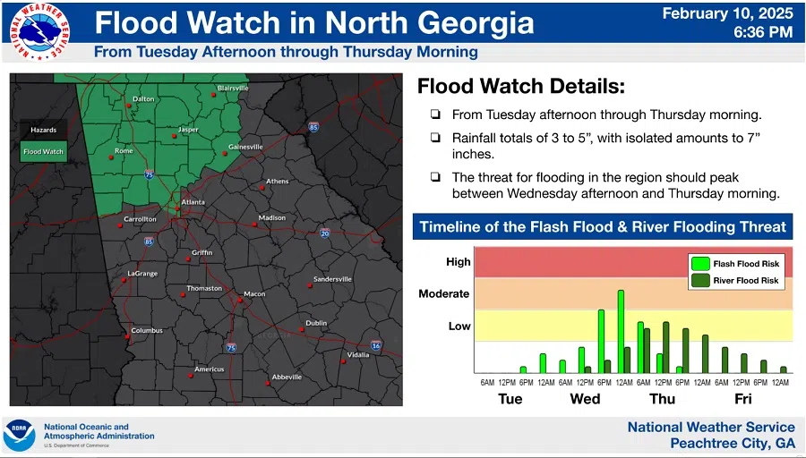 There is a Slight Risk (Level 2 of 4) for flash flooding and river flooding in north Georgia between Tuesday afternoon and Thursday morning. The potential exists for this risk to be increased to Moderate Risk (Level 3 of 4) with future forecast updates.