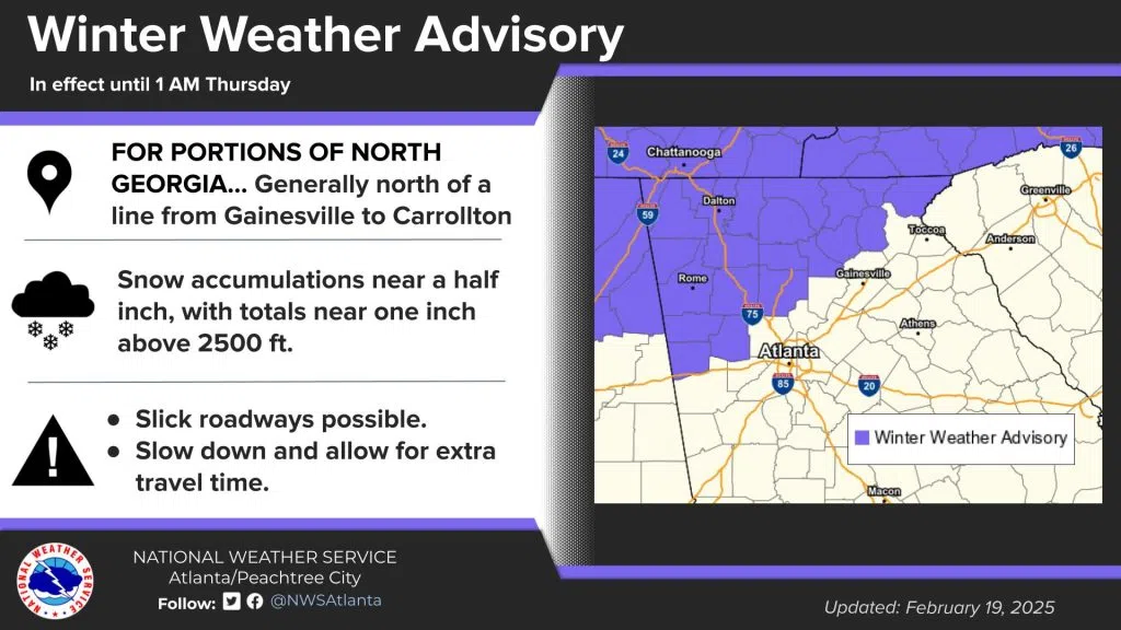 The Winter Weather Advisory has been expanded since the previous update last night to include Bartow, Cherokee, Haralson, Paulding, and Polk Counties out of an abundance of caution.