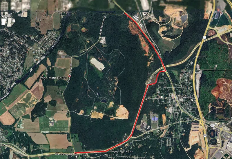 Motorists traveling east on Old Alabama Road to reach Paga Mine Road will follow Old Alabama Road and take Red Top Mountain Road to the State Route 293 Connector.