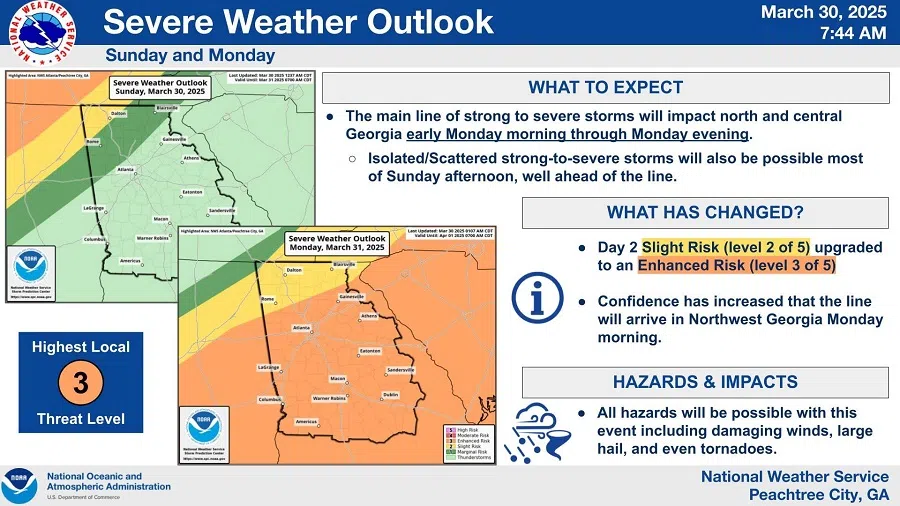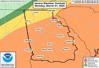A line of thunderstorms will enter far northwest Georgia early Monday morning, advancing southward throughout the day.