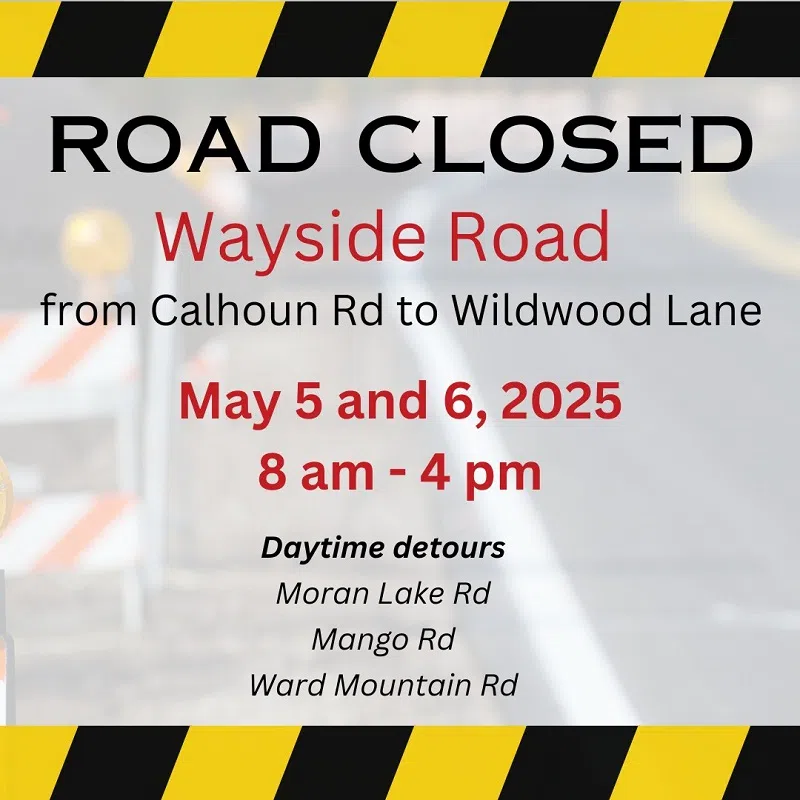 Daytime detours will be Moran Lake Road, Mango Road and Ward Mountain Road.