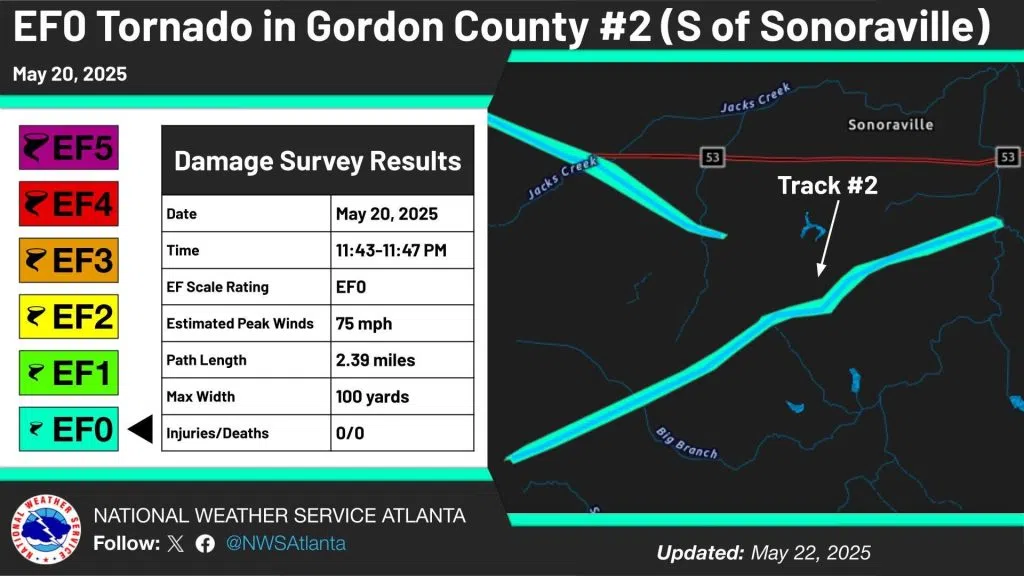 The second tornado was south of Sonoraville with a path length of 2.39 miles and peak winds of 75 mph.