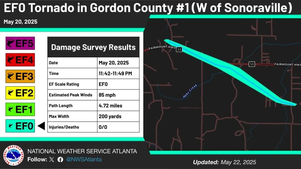 The National Weather Service has confirmed two EF0 tornadoes that occurred in Gordon County during the severe weather event we saw last week.