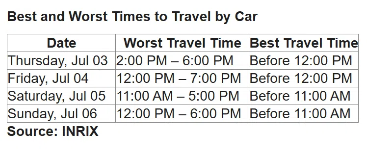 According to INRIX, expect heavy road congestion on Wednesday, July 2 and Sunday, July 6. The busiest times will be afternoons, while mornings offer the best escape from traffic.