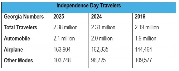 - Other Modes: Nearly 104,000 Georgians will take buses, trains, or cruises (+7,000, up 7% from last year).