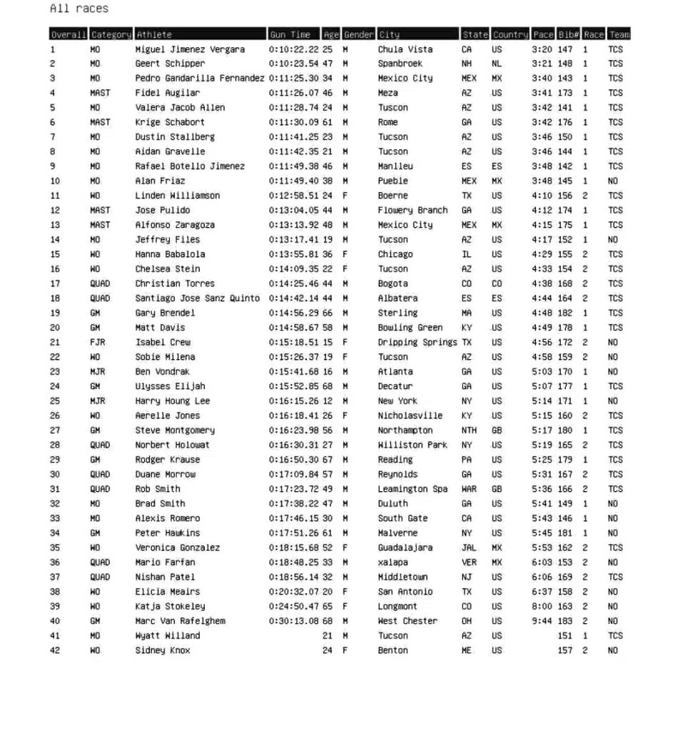 Christian Torres of Bogota, Colombia, had the top time in the Quad Division at 14:25.46.
