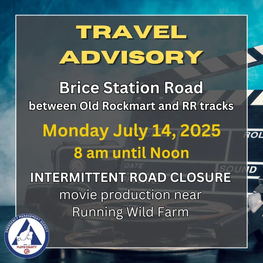 Brice Station Road will be closed intermittently between 8 a.m. and noon due to a film production near Running Wild Farm.