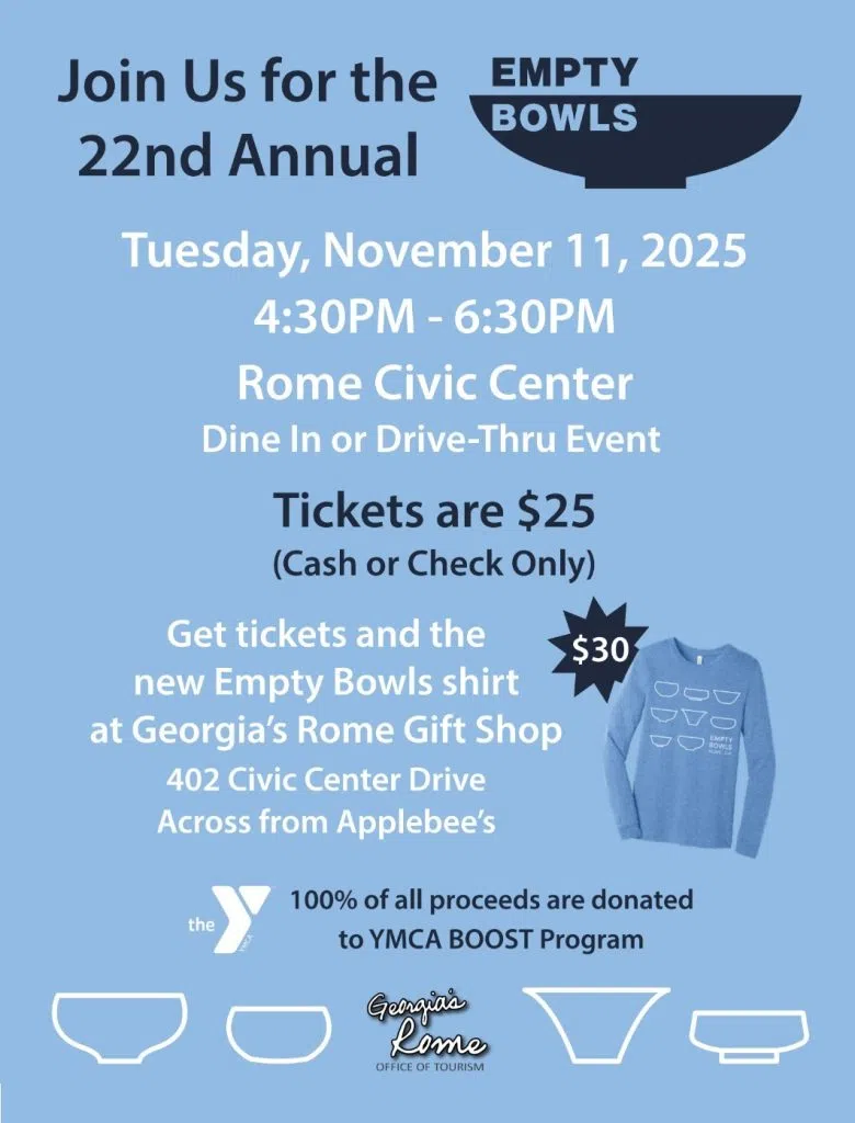 The Georgia’s Rome Welcome Center & Gift Shop is proud to announce that tickets are now available for the 22nd Annual Empty Bowls, a beloved community tradition. This year’s event will be held on Tuesday, November 11, 2025, from 4:30 p.m. to 6:30 p.m. at the Rome Civic Center.