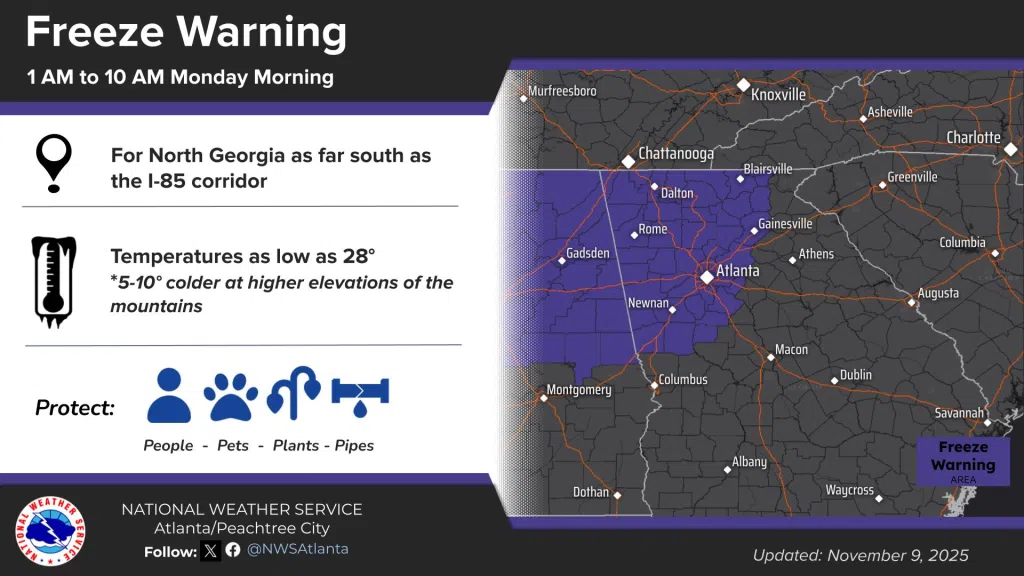 Sub-freezing temperatures of 20-27 are expected across all of north and central Georgia.