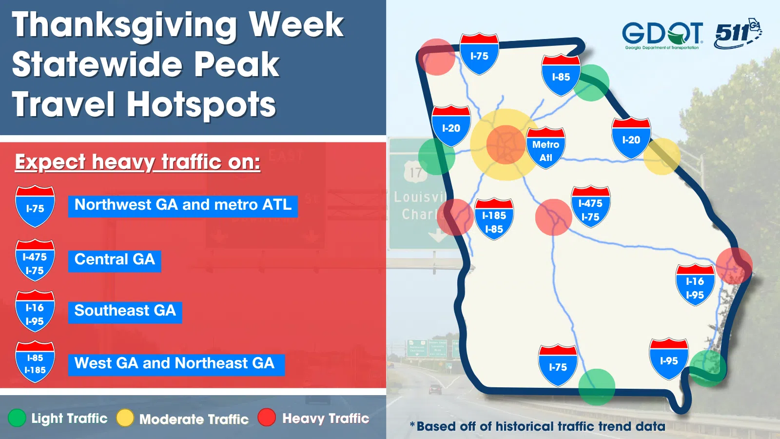 For real-time road conditions and updates, visit the Georgia DOT website or use our 511GA app. Georgia DOT wishes all travelers a safe and enjoyable Thanksgiving holiday!