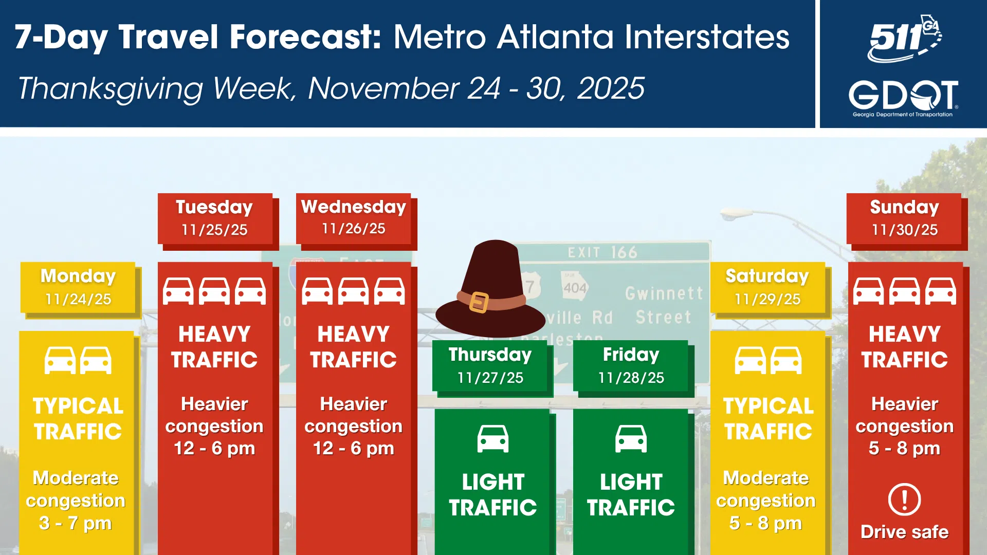 Georgia DOT expects traffic congestion on metro Atlanta interstates to begin increasing Monday, November 24, in the afternoon with Wednesday, November 26 anticipated to experience heavier than normal traffic levels. Additionally, Saturday, November 29, poses a higher risk for crashes, and motorists should remain vigilant. Post-holiday congestion is likely to peak between 5 p.m. and 8 p.m. on Sunday.