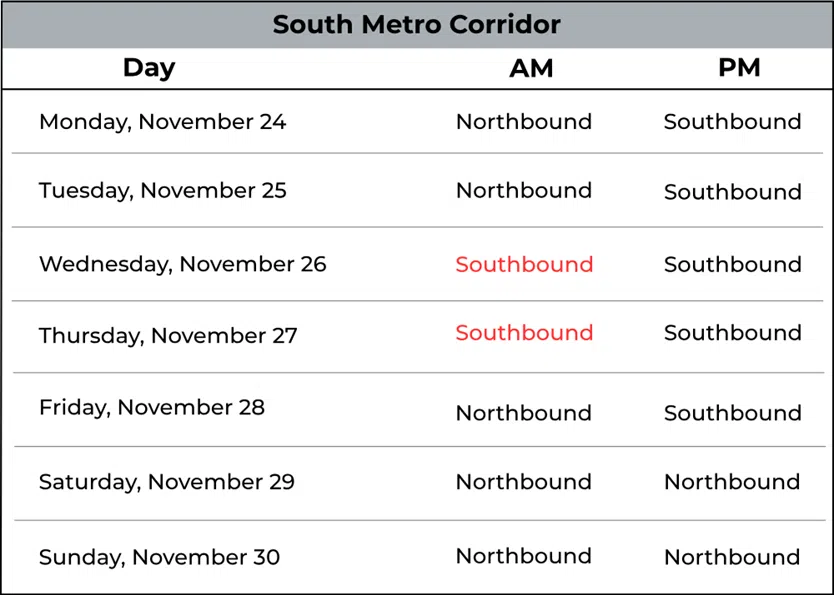 - Motorists should expect moderate post-holiday congestion to return on Sunday, Nov. 30 from 5 to 8 p.m.