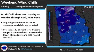 Dangerously cold wind chills ranging from as cold as 15 degrees below zero in the north Georgia mountains to the single digits above zero in central Georgia.