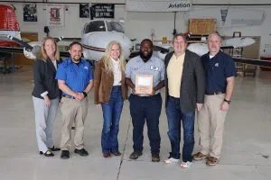 (From left) Dr. Heidi Popham, president of GNTC; Zac Fager, program director and instructor of Aviation Maintenance Technology at GNTC; Kathi Vroman, scholarship donor; O’Darius Davis, scholarship recipient; Tim Vroman, scholarship donor; and Jon Byrd, executive director of Aviation at GNTC and TCSG State Aviation Advisor, pose for a picture in the hangar at GNTC’s Aviation Training Center after Davis was presented with the 2026 Matthew Vroman Memorial Scholarship.