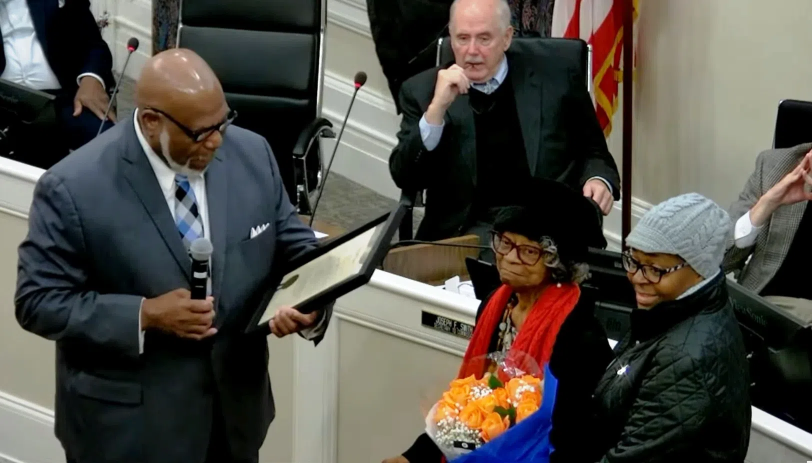 Rome City Commissioner Bill Collins (left) reads a proclamation honoring Ms. Helena Finley (center) during Monday’s Rome City Commission meeting.