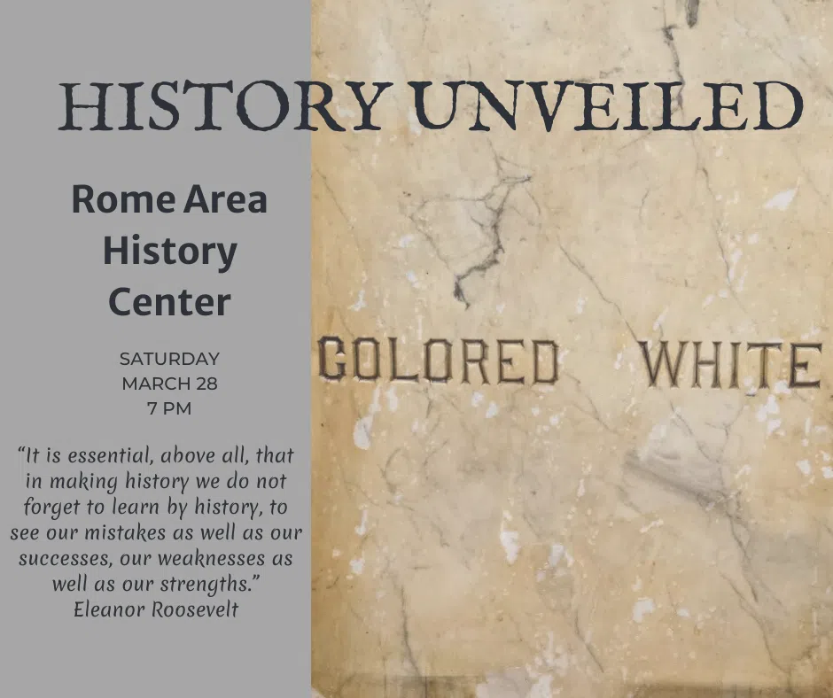 The Rome Area History Center will unveil a newly discovered civil rights artifact on March 28, 2026. The piece was uncovered last year by plumbers working inside the former Kress Department Store on Broad Street, where they found a marble sign hidden behind a wall. The sign, etched with the words “white” and “colored” to mark segregated drinking fountains, is believed to date back to 1927.